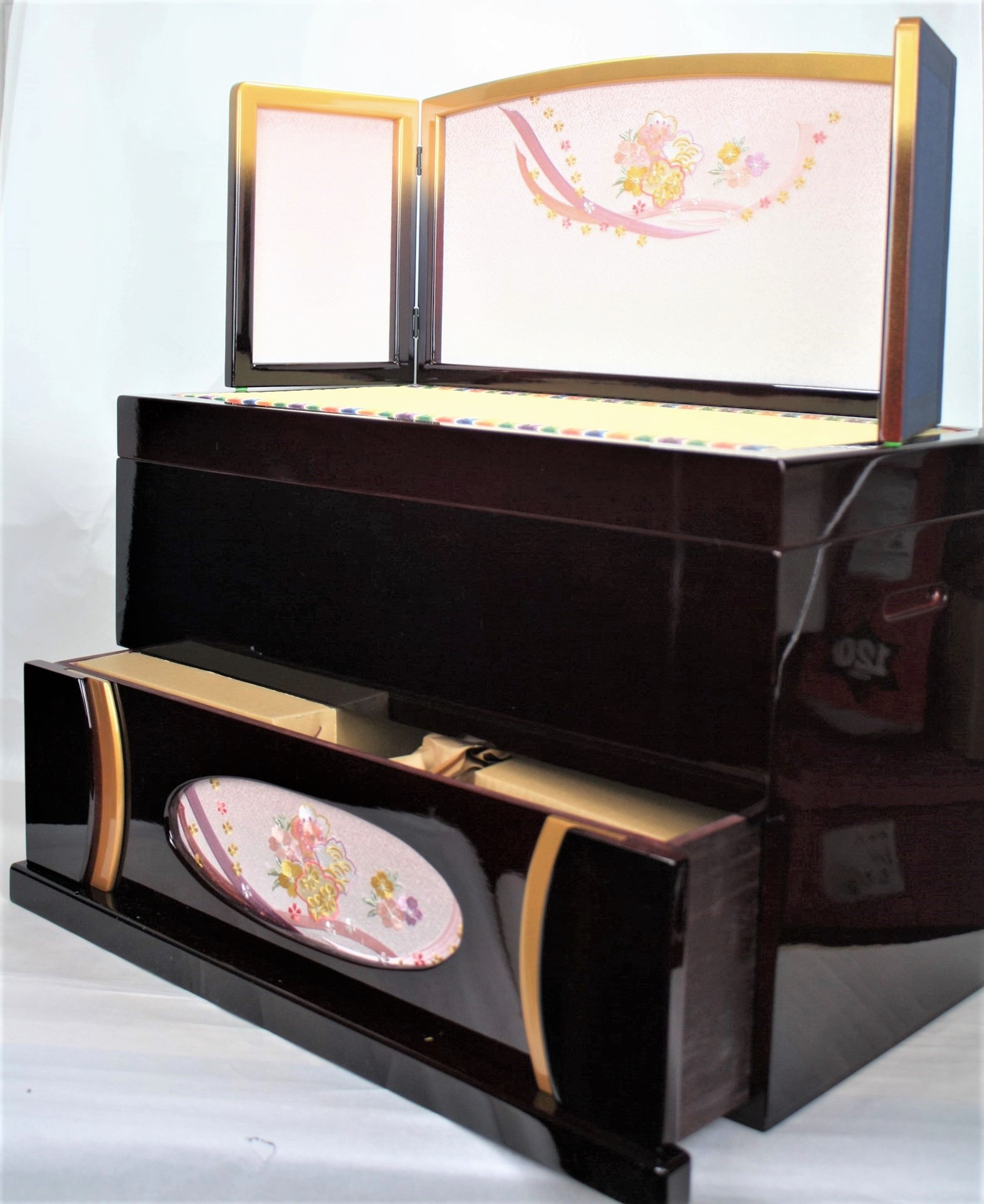 豪華な三段収納箱飾りのお雛様ですので、お求めになってご自宅で飾るには高額となりますが、レンタルなら安価で飾る事が出来ます。
