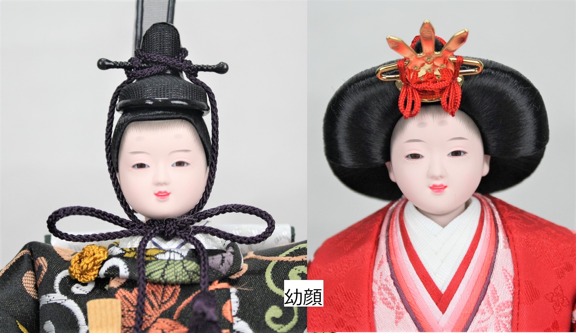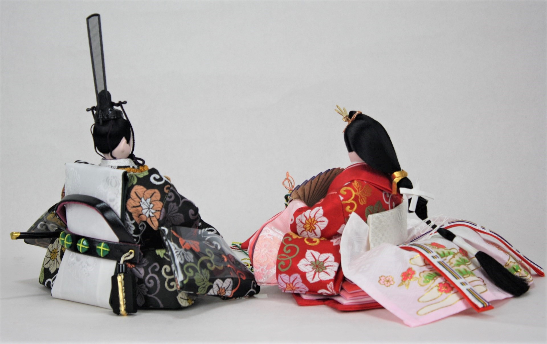 黒塗り屏風に平安時代の正装に必需品として金箔扇柄が重厚感がございます。長寿を願う桐唐草模様の衣装を着せております。