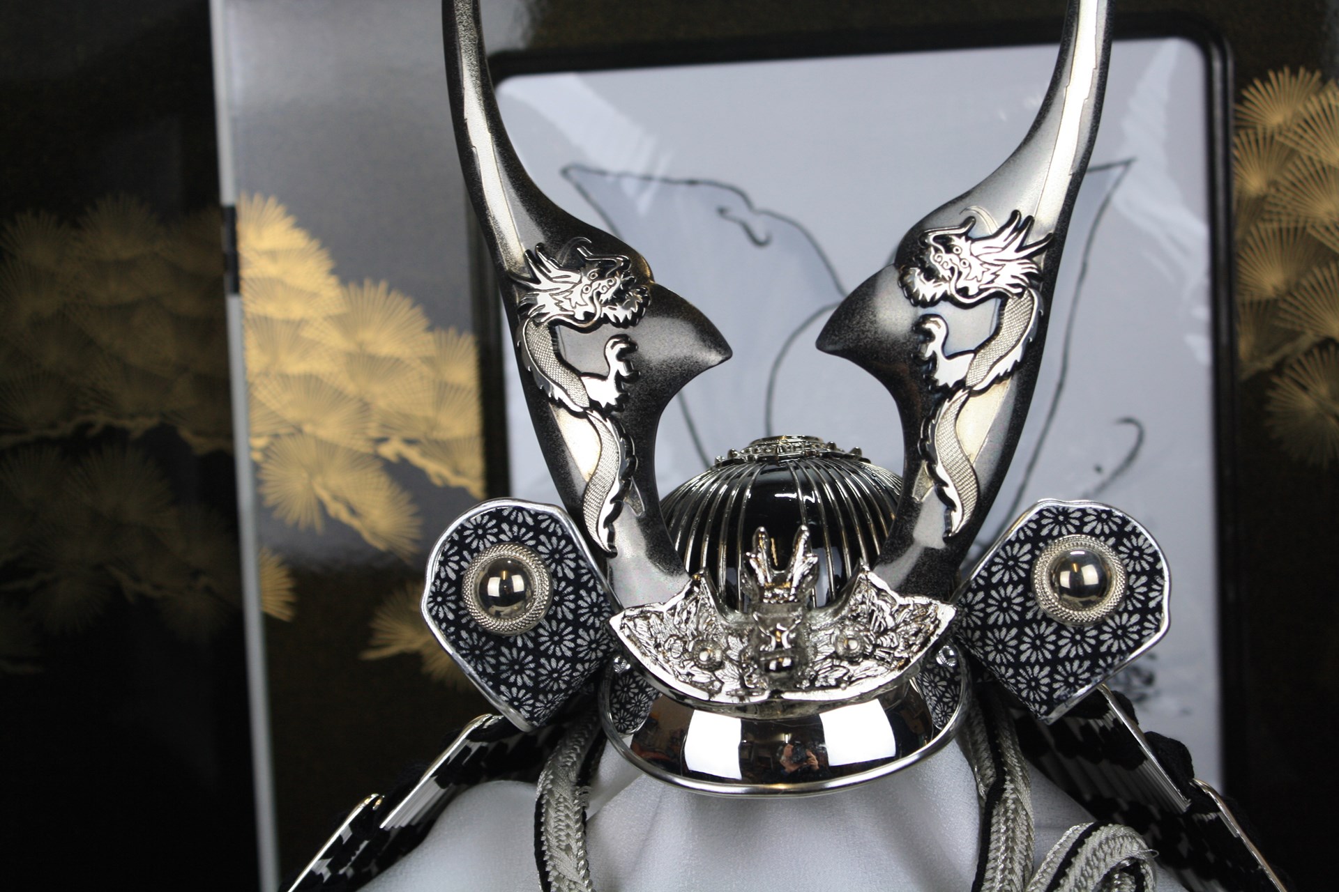 墨絵で描かれた色紙が入った屏風に、ブロンズとシルバーの兜がオシャレです。 お子様の名前が入った旗を横にお飾りください。