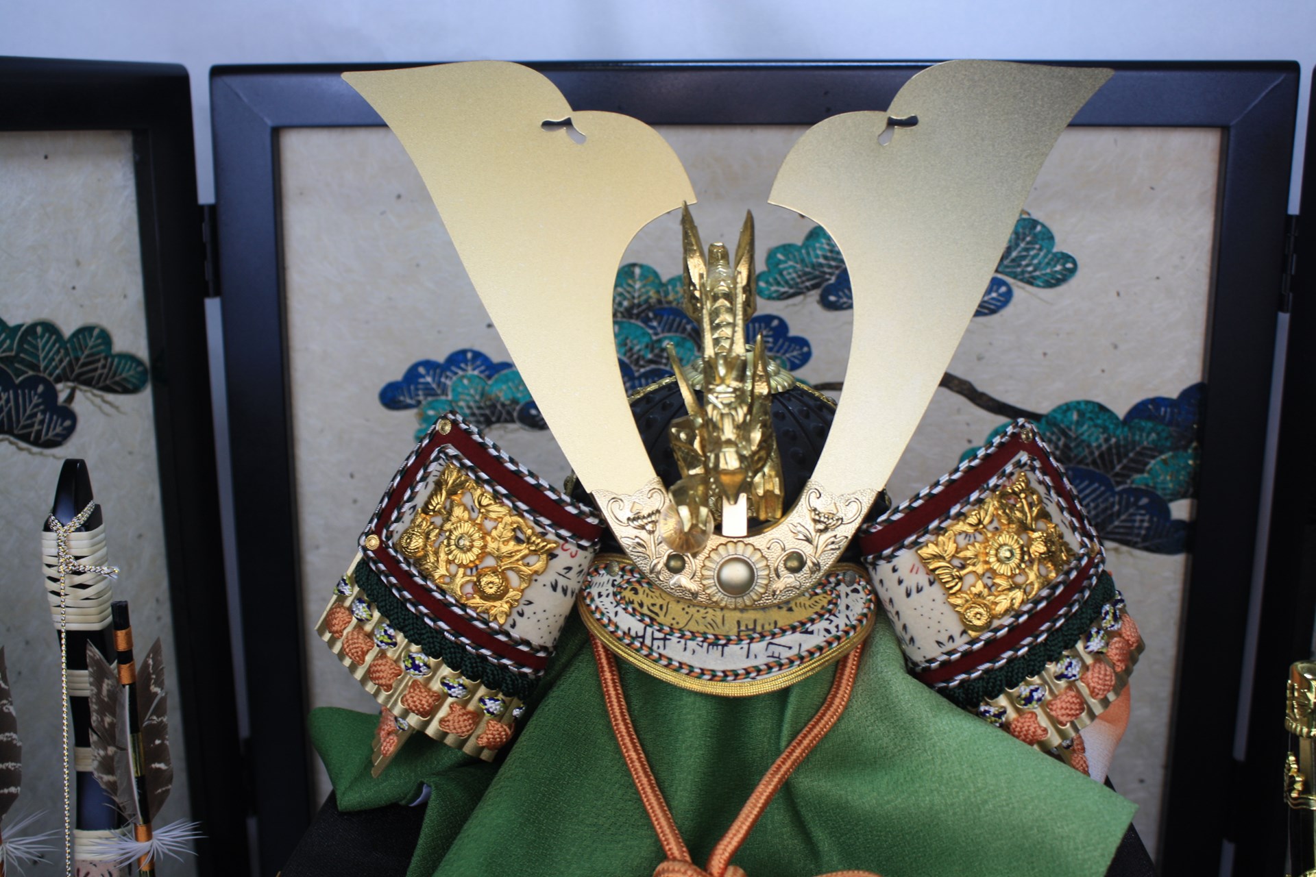 オオクワガタの角の兜に和紙で松柄の屏風、両サイドには菖蒲の花が付いて豪華なセットです。