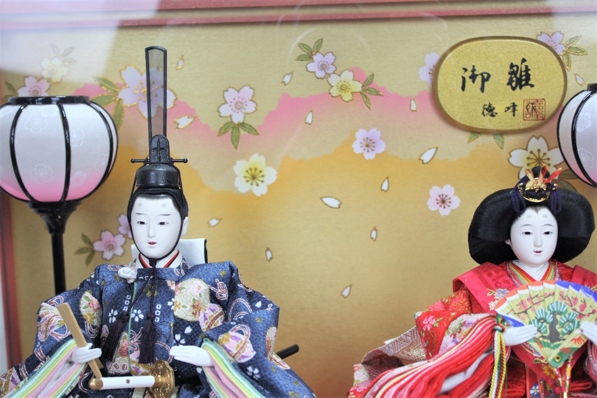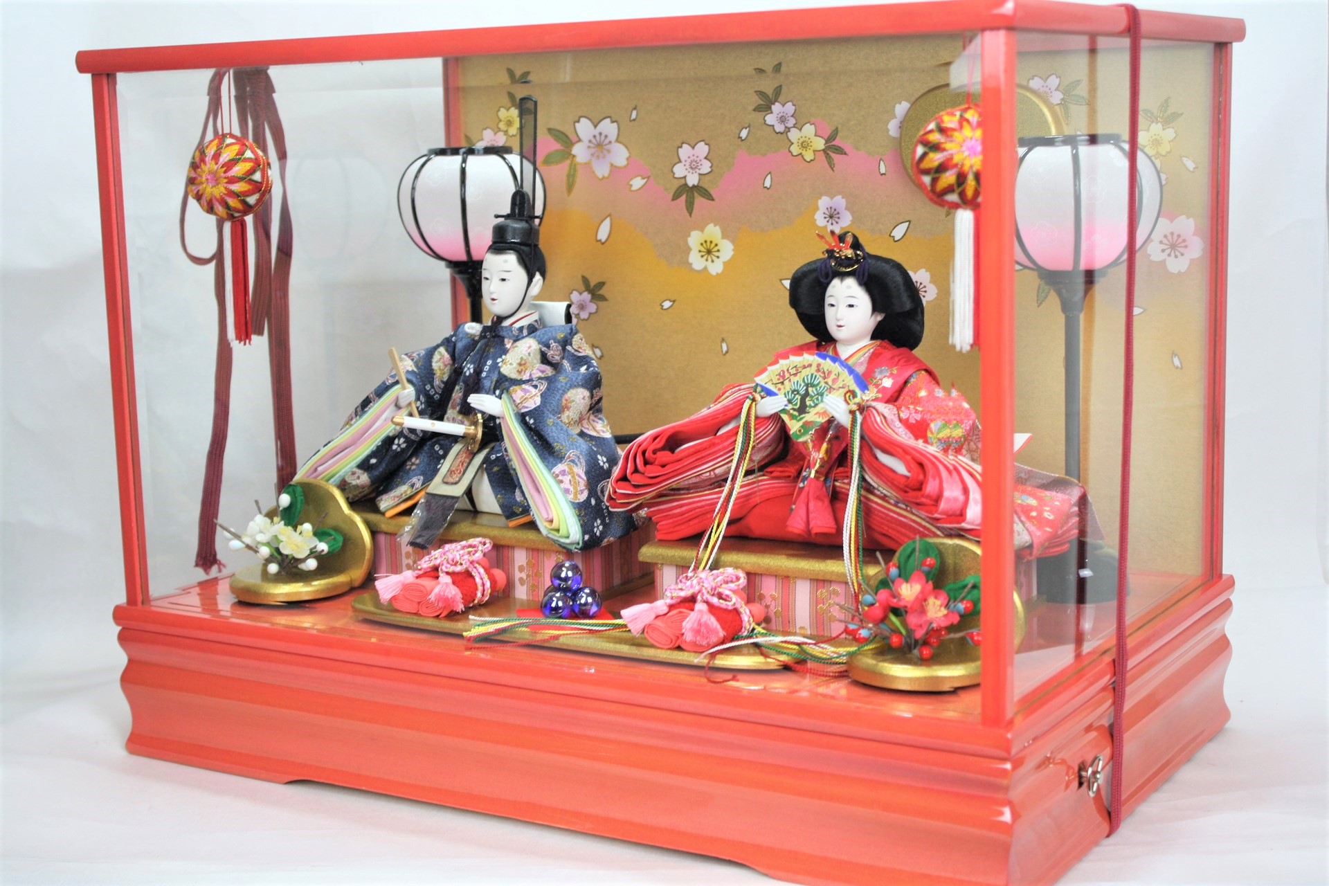 優しいサーモンピンクのケースに可愛い小物や毬が飾られたお雛様ケースです。