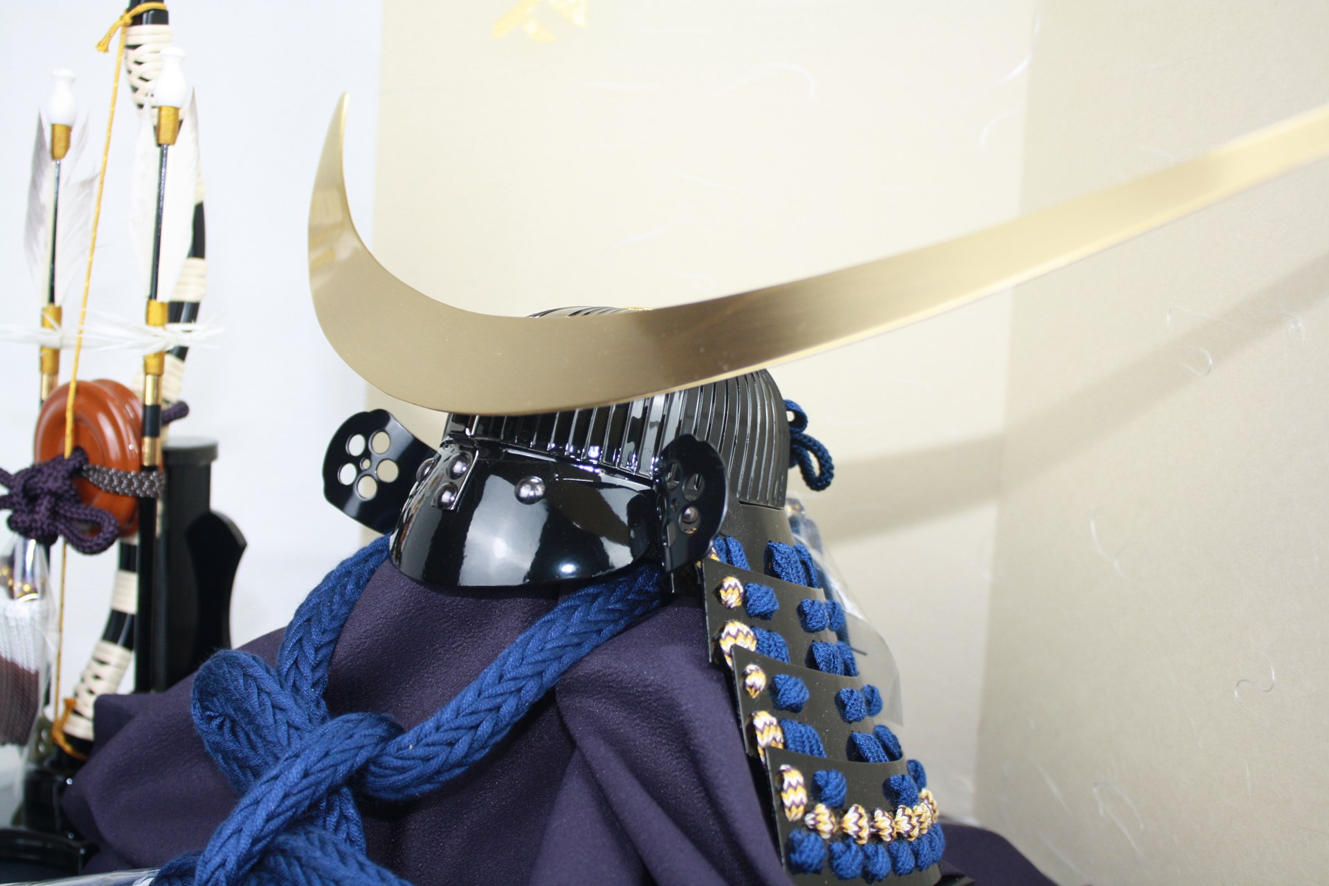 紺の収納箱に伊達政宗の三日月のゴールド角(つの)が?風と収納箱にマッチした素敵なセットです。